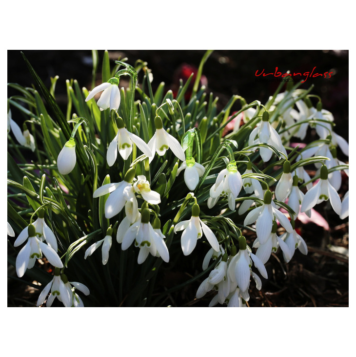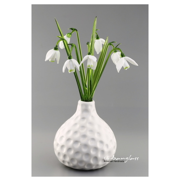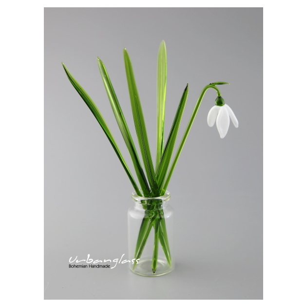 Stylizovaná skleněná sněženka s lístkem bez vázičky.